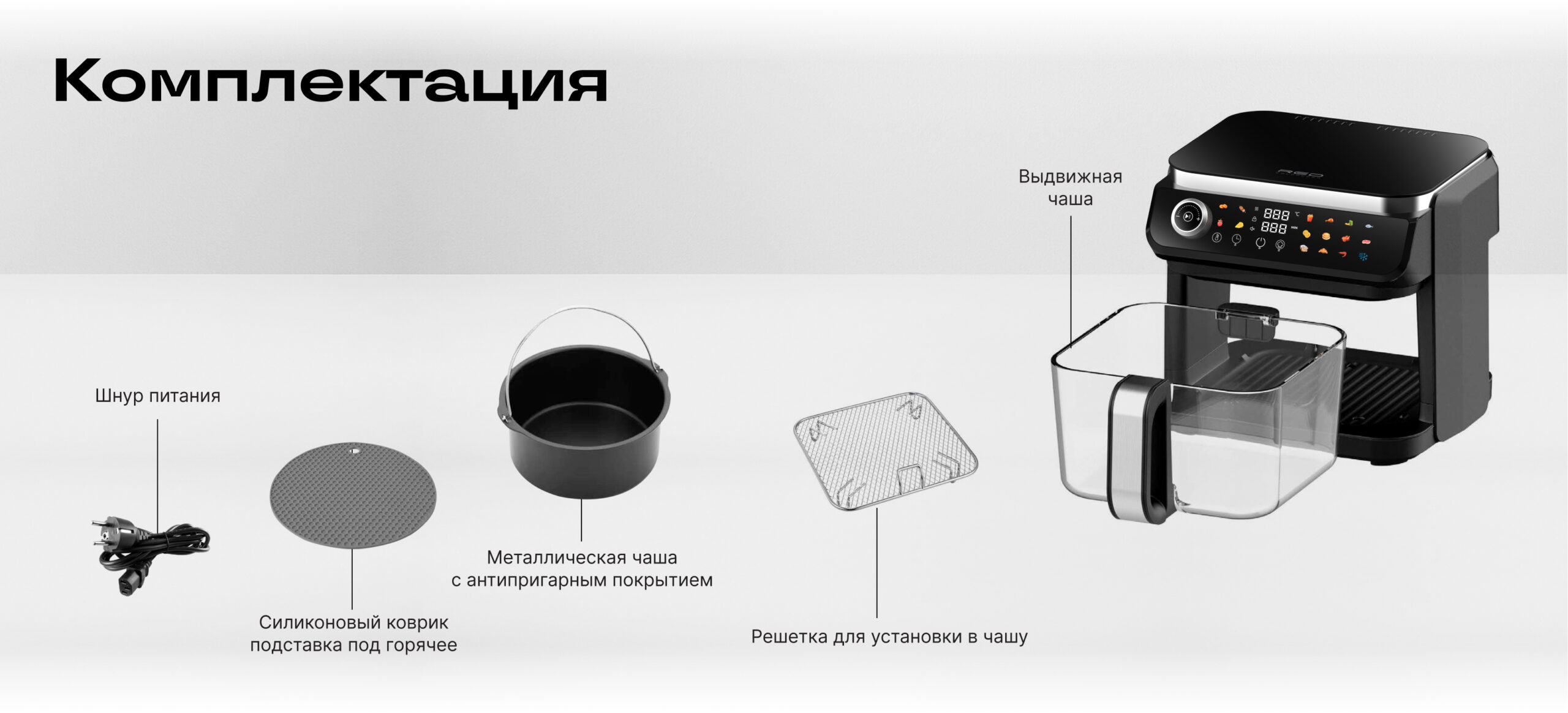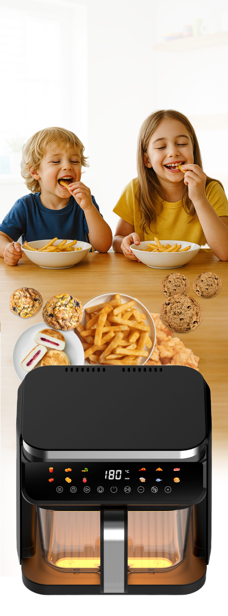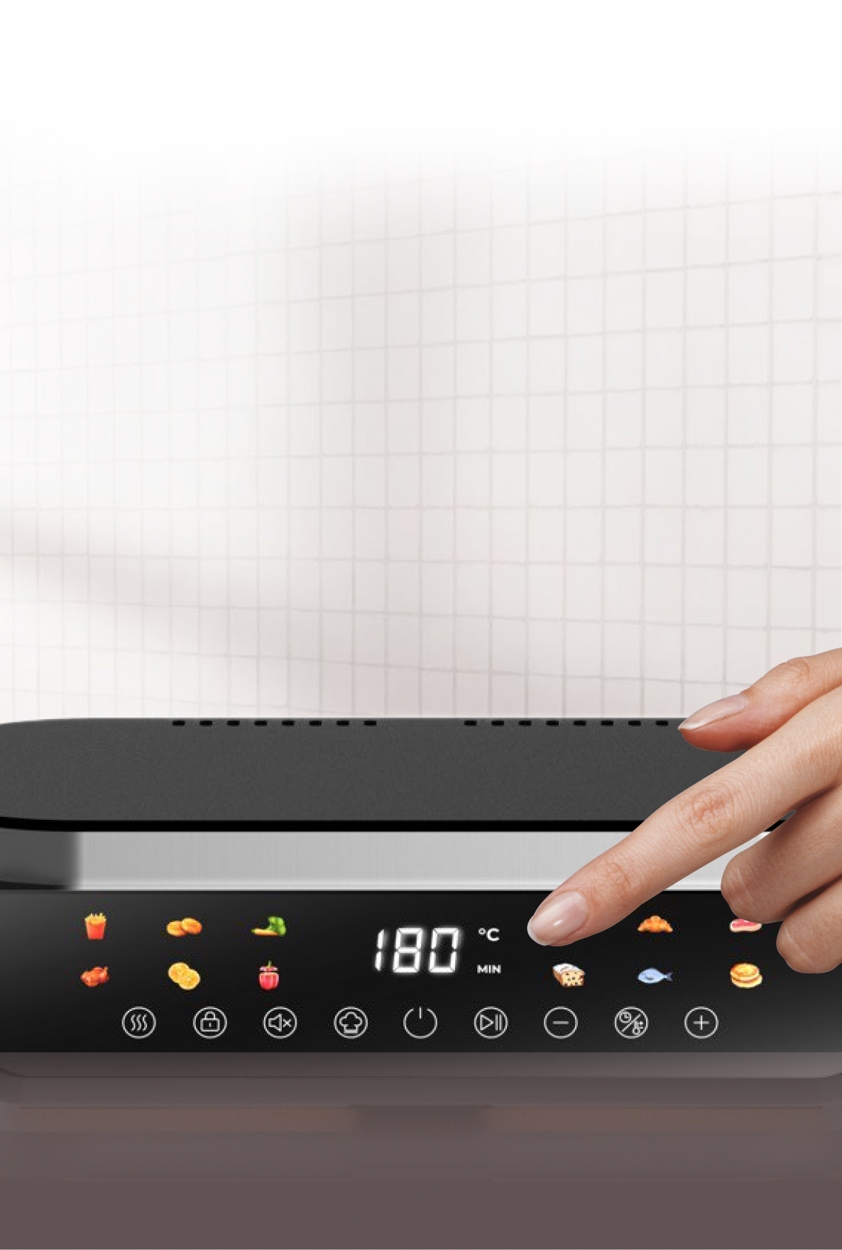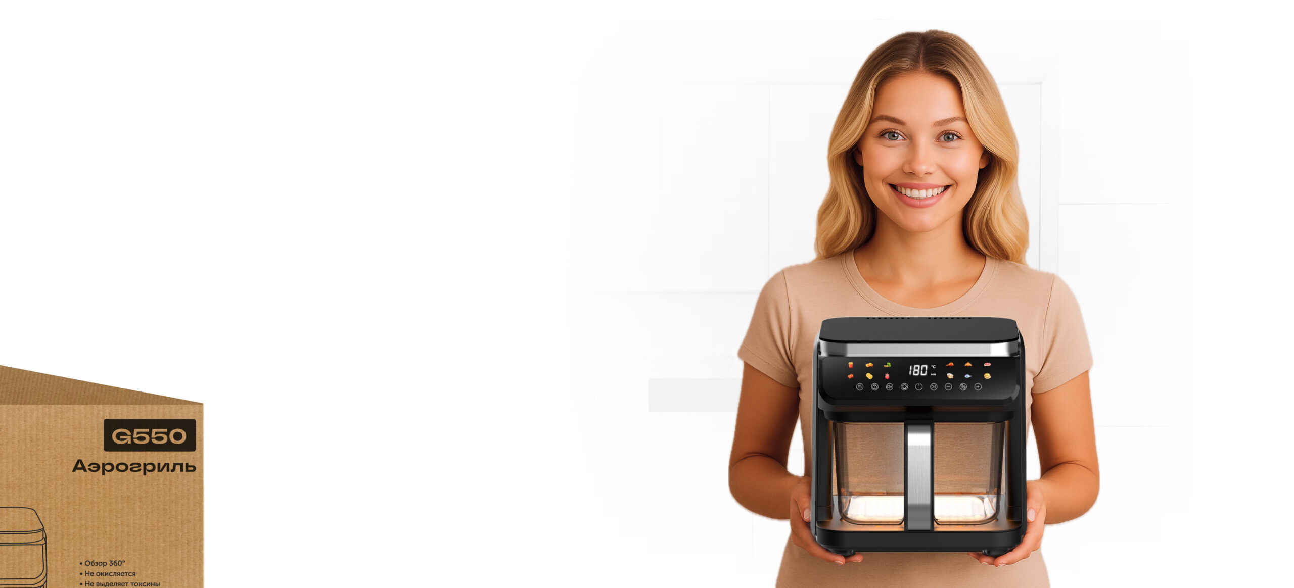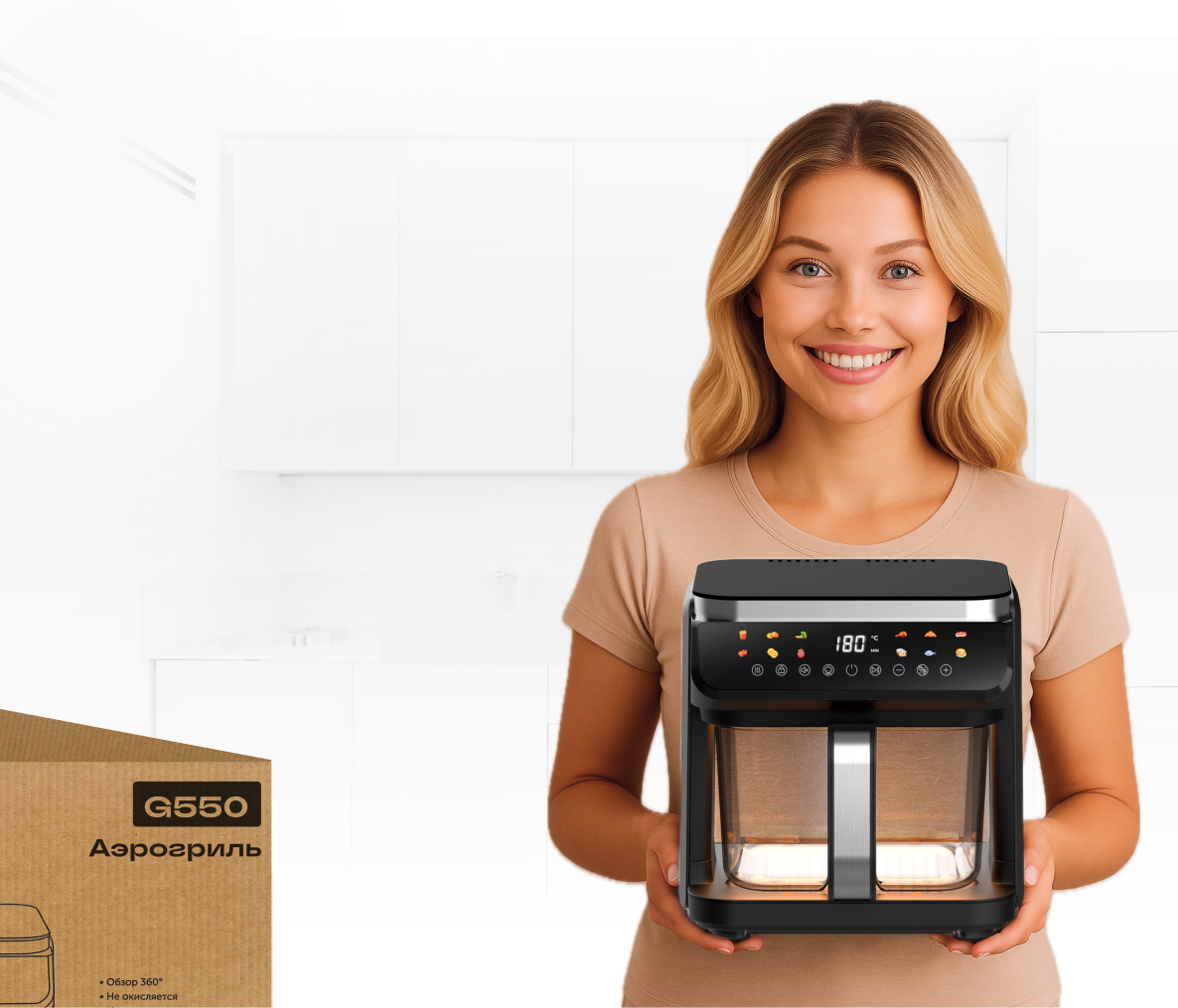 Аэрогриль оснащён вместительной чашей 5,5 л из ЭКО-стекла с толщиной стенок 5 мм, что помогает обеспечивать равномерный нагрев и стабильный результат. Такой объём удобен для повседневных блюд и приготовления еды для всей семьи.