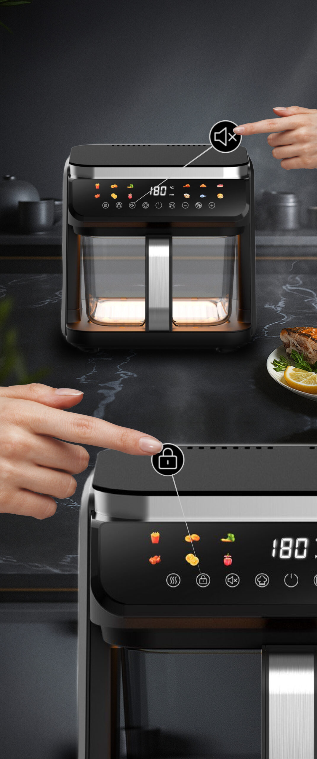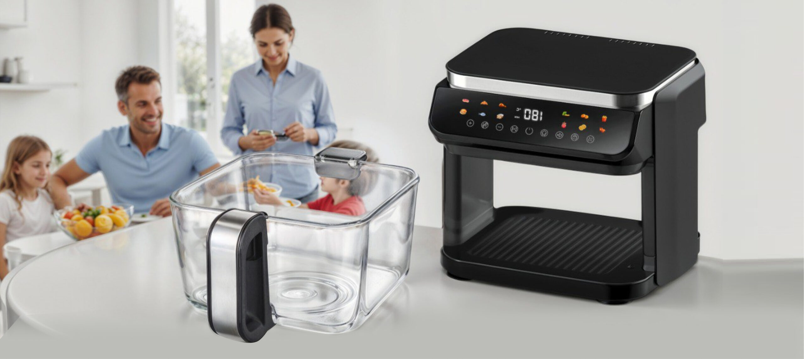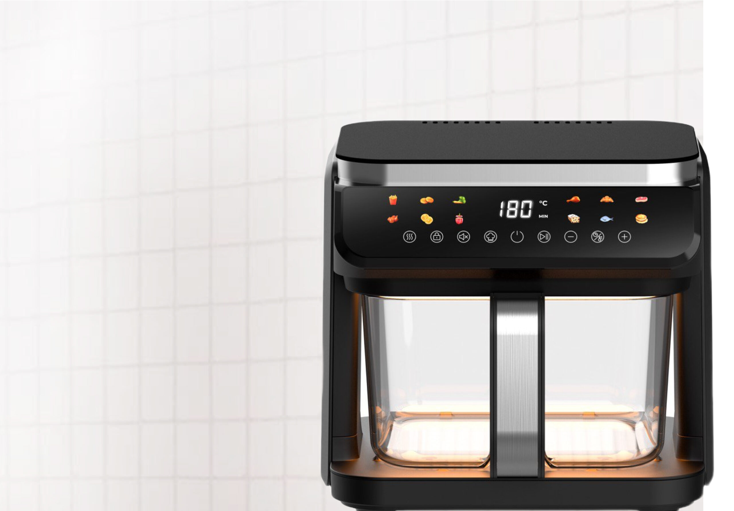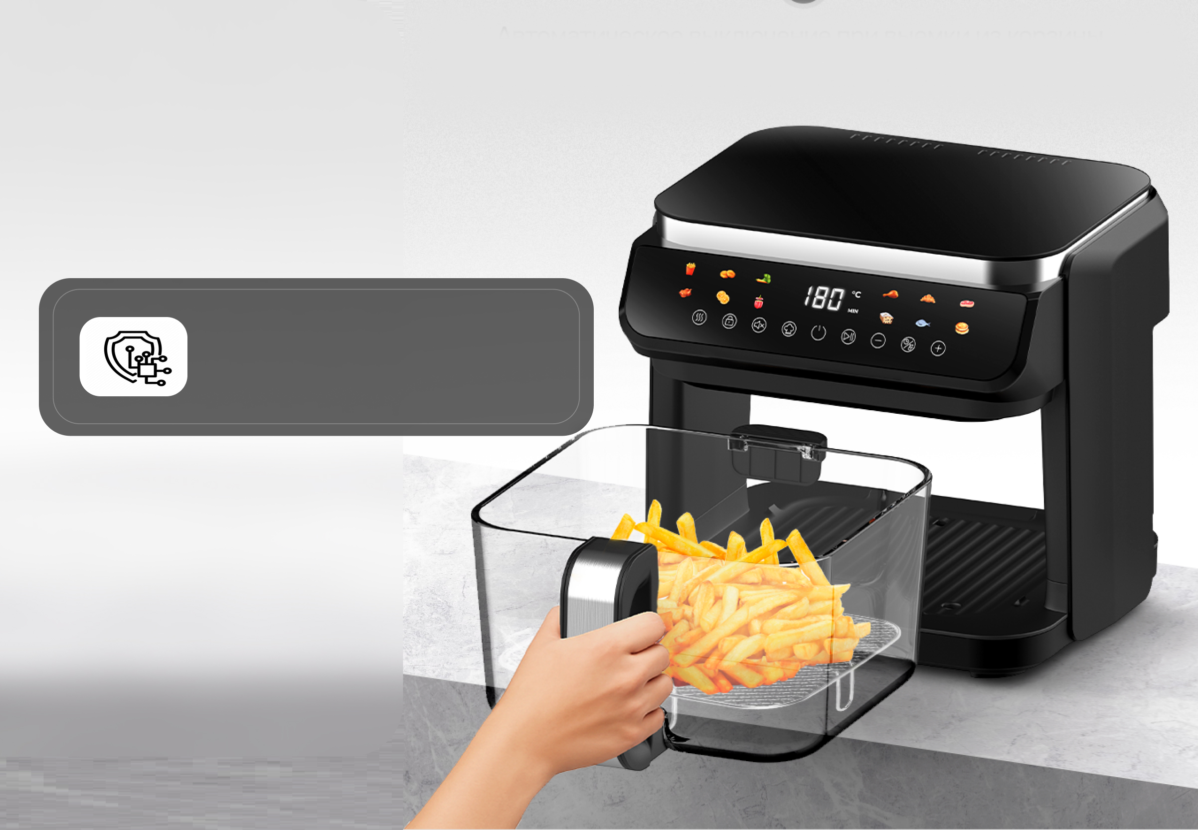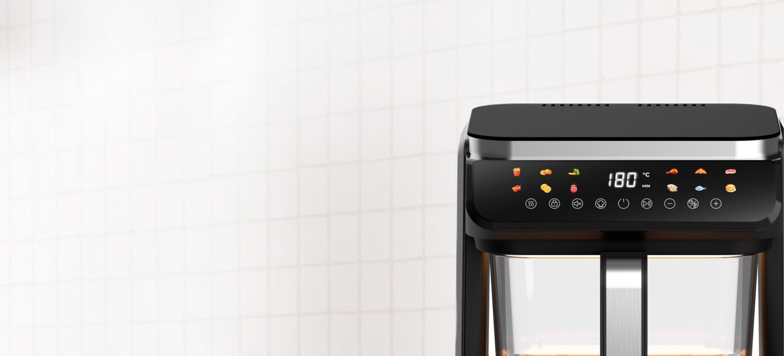 Аэрогриль оснащён вместительной чашей 5,5 л из ЭКО-стекла с толщиной стенок 5 мм, что помогает обеспечивать равномерный нагрев и стабильный результат. Такой объём удобен для повседневных блюд и приготовления еды для всей семьи.