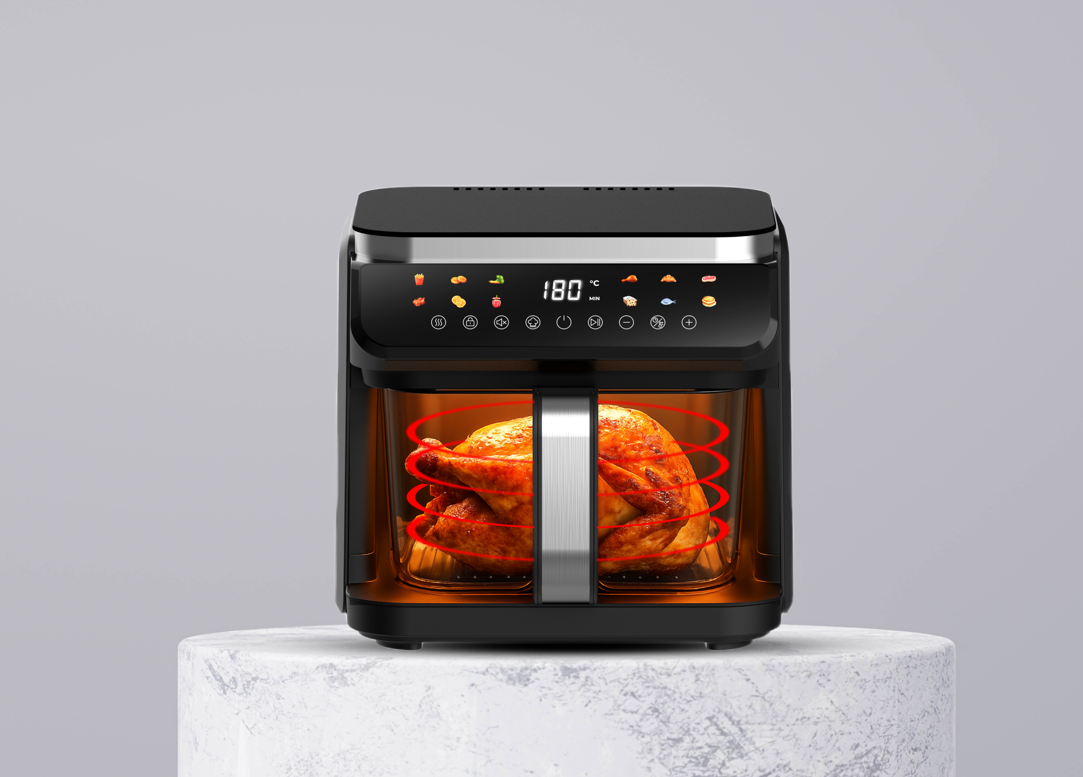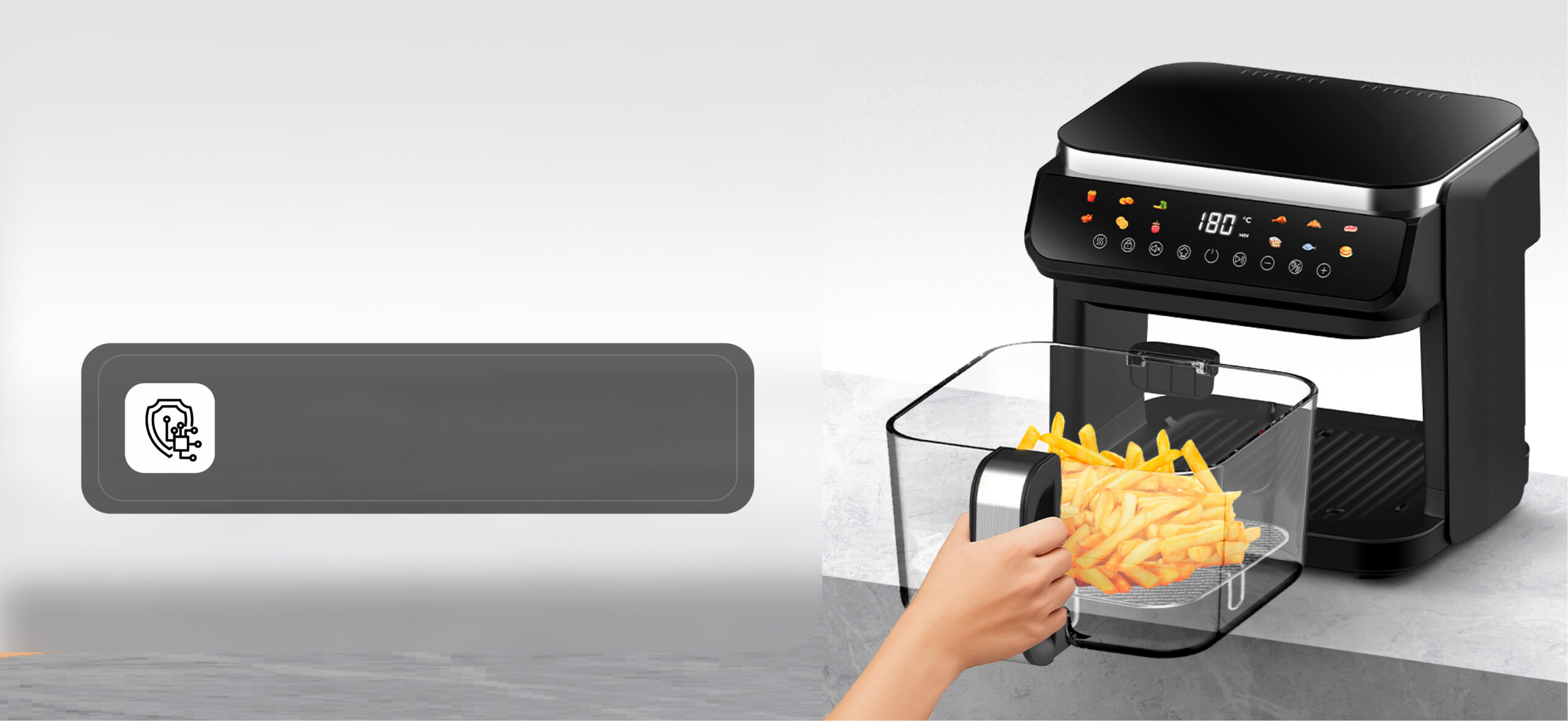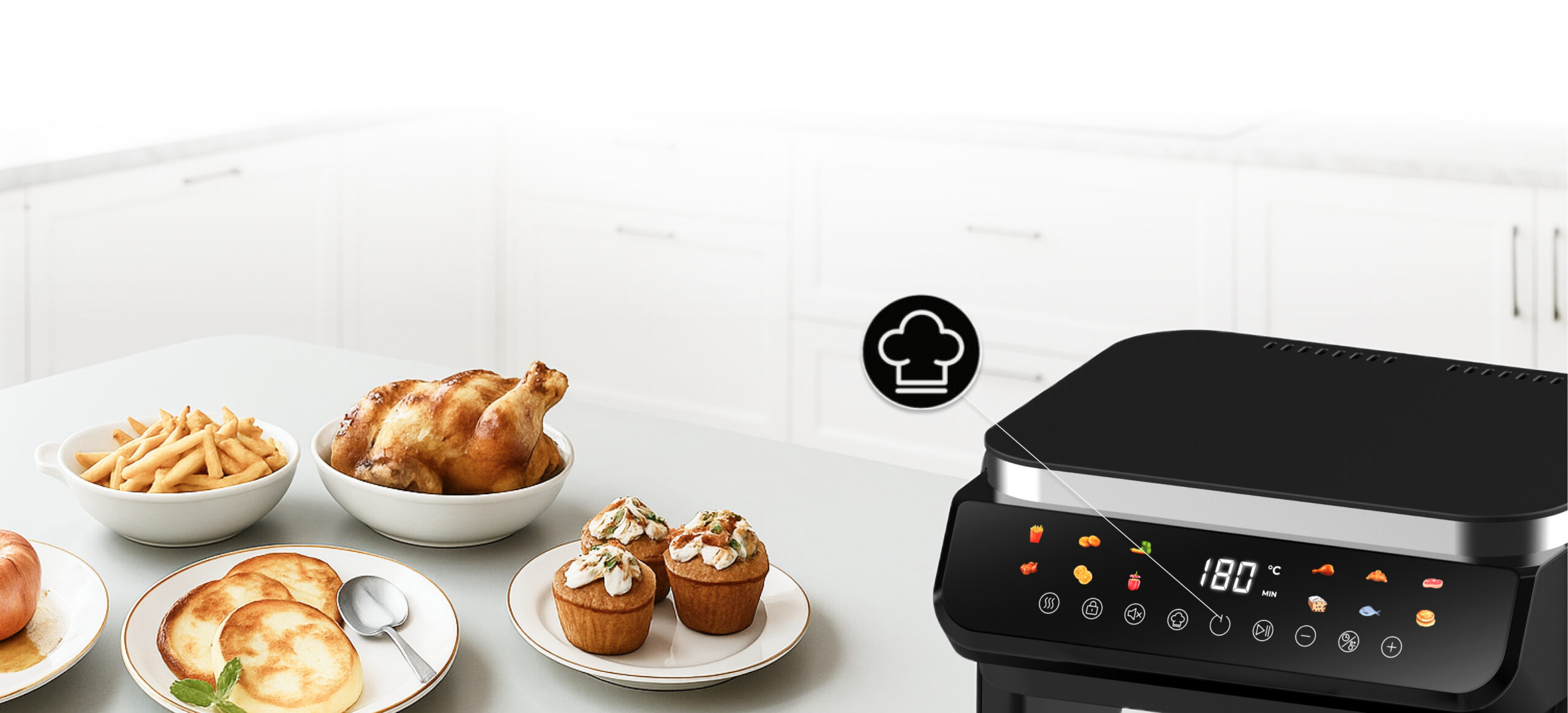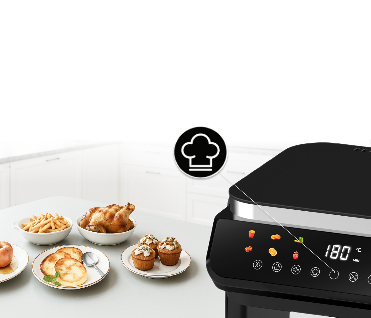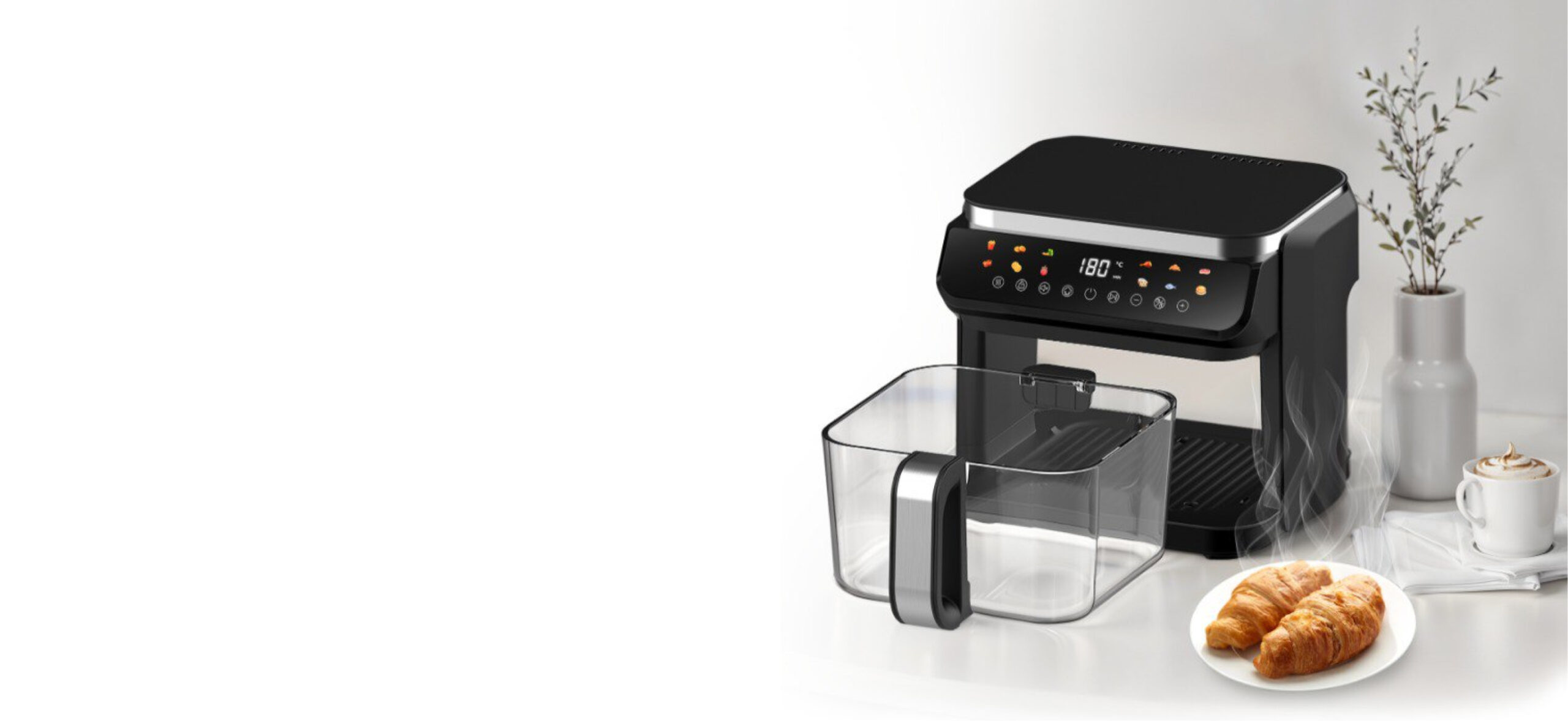 Аэрогриль оснащён вместительной чашей 5,5 л из ЭКО-стекла с толщиной стенок 5 мм, что помогает обеспечивать равномерный нагрев и стабильный результат. Такой объём удобен для повседневных блюд и приготовления еды для всей семьи.