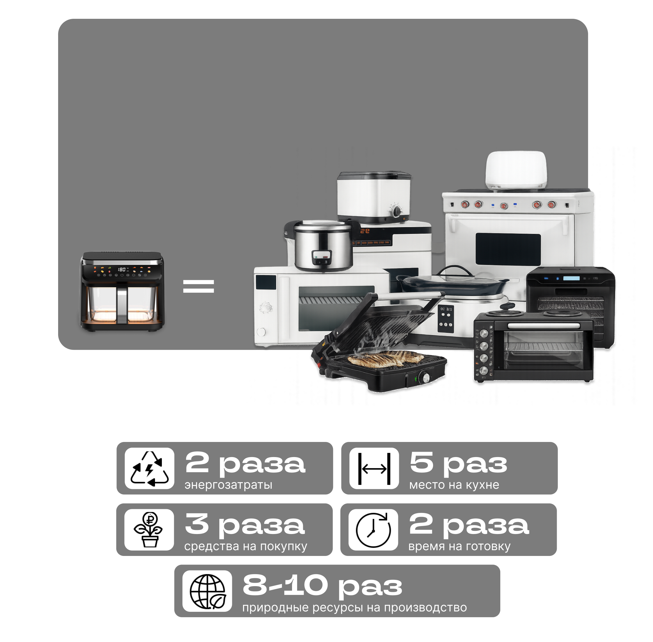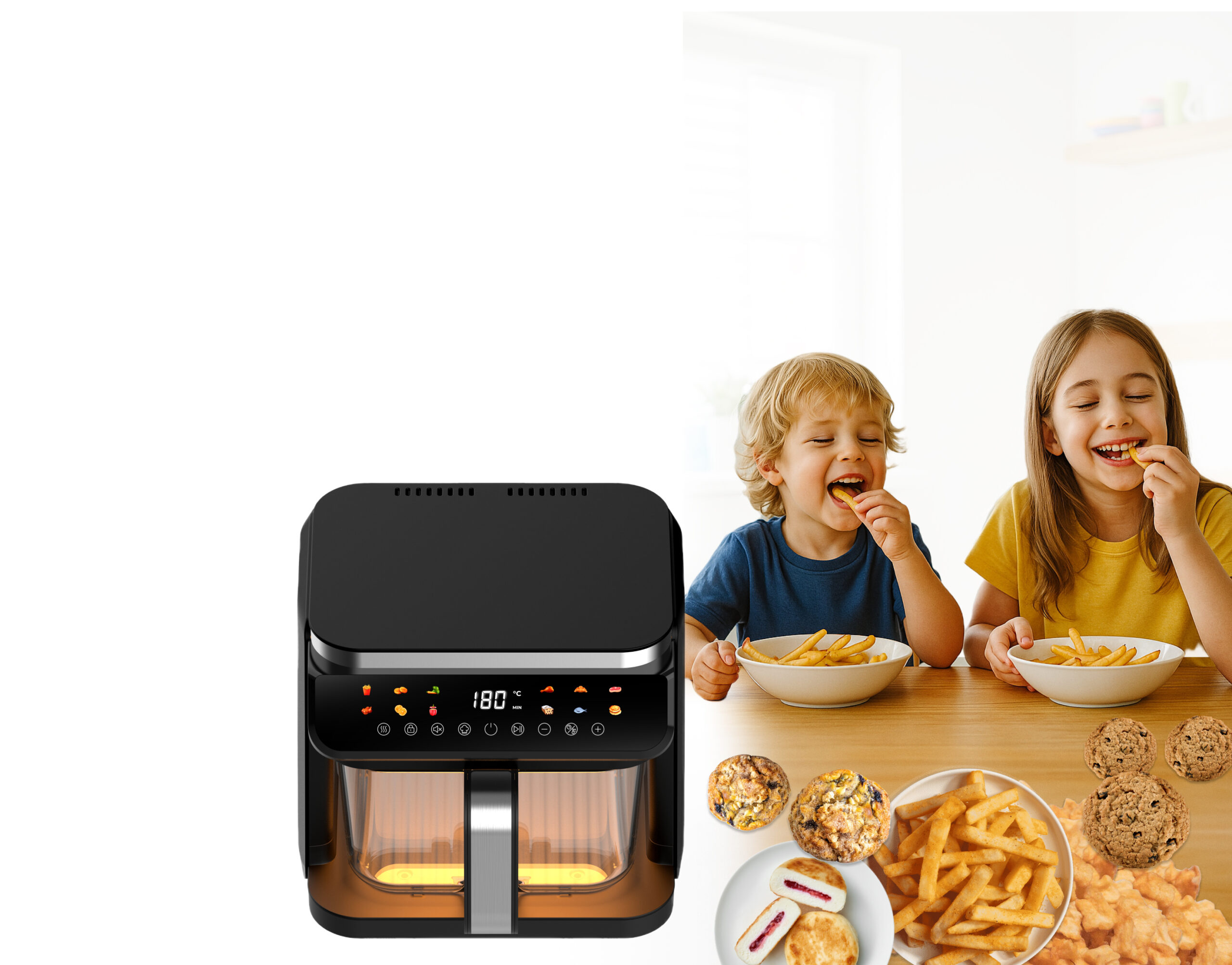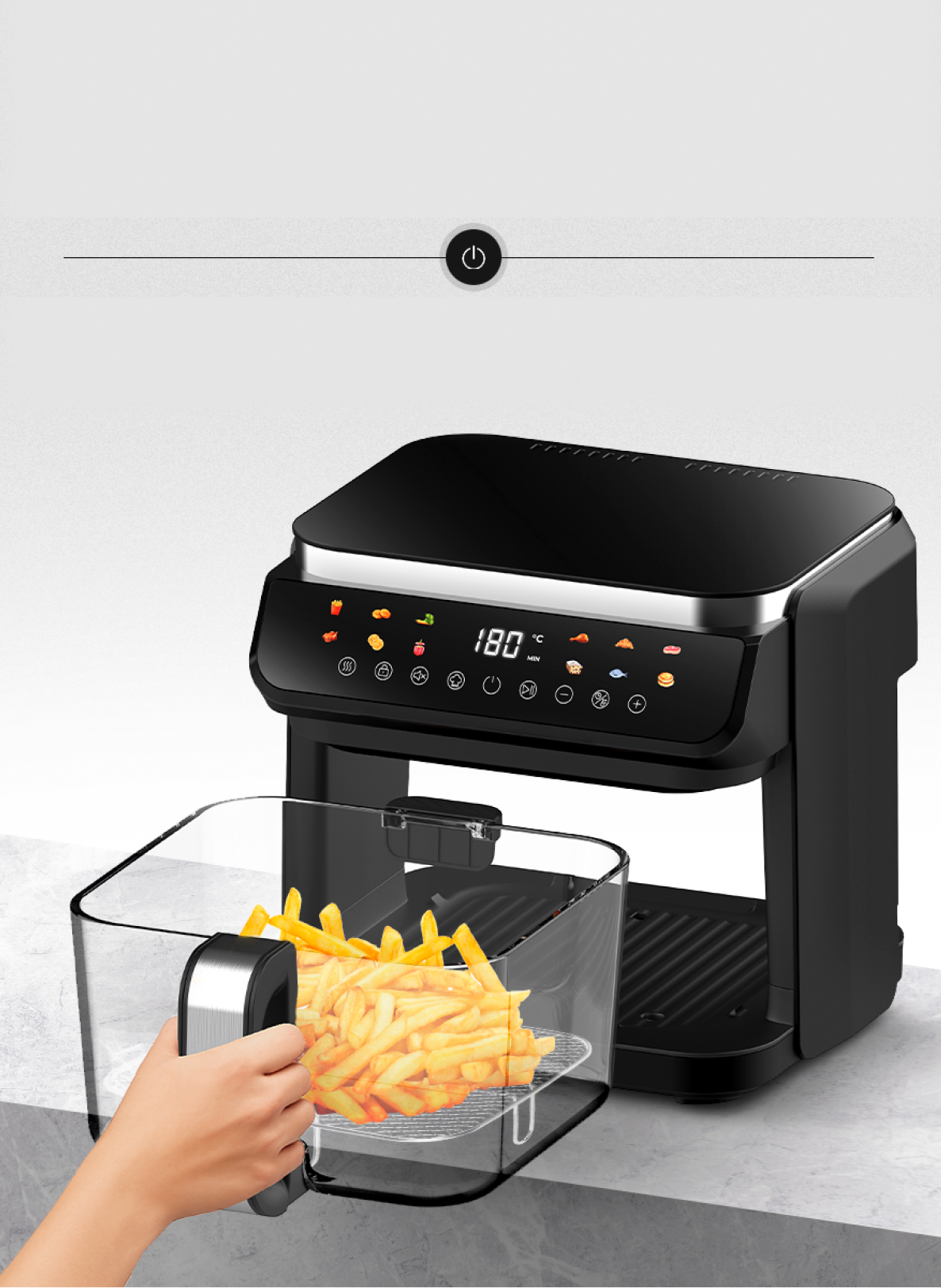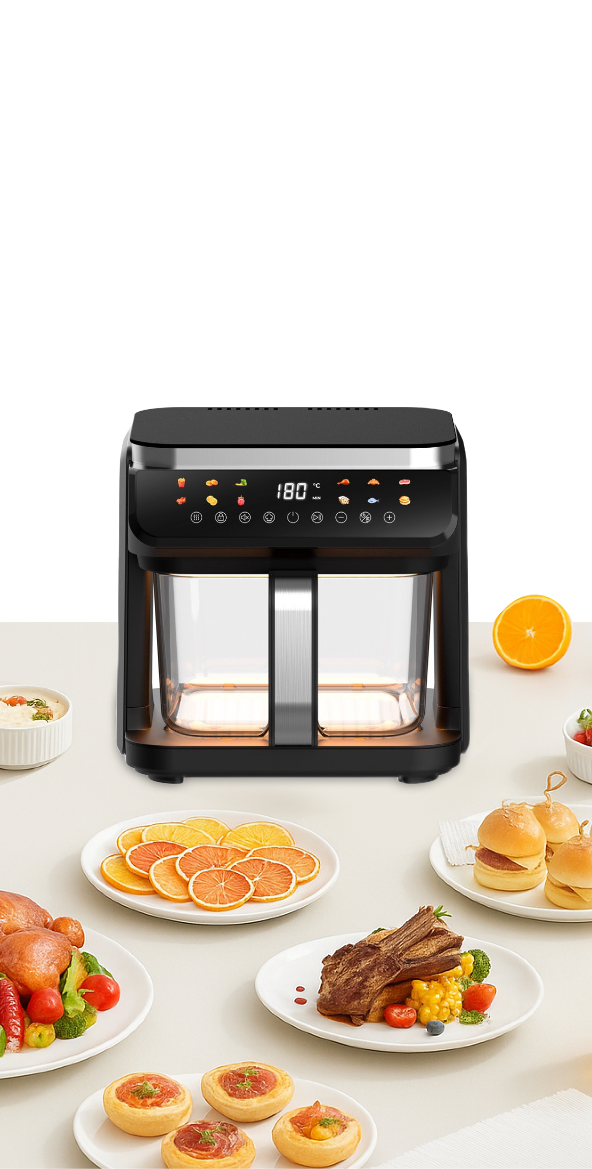 Аэрогриль оснащён вместительной чашей 5,5 л из ЭКО-стекла с толщиной стенок 5 мм, что помогает обеспечивать равномерный нагрев и стабильный результат. Такой объём удобен для повседневных блюд и приготовления еды для всей семьи.