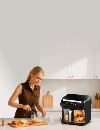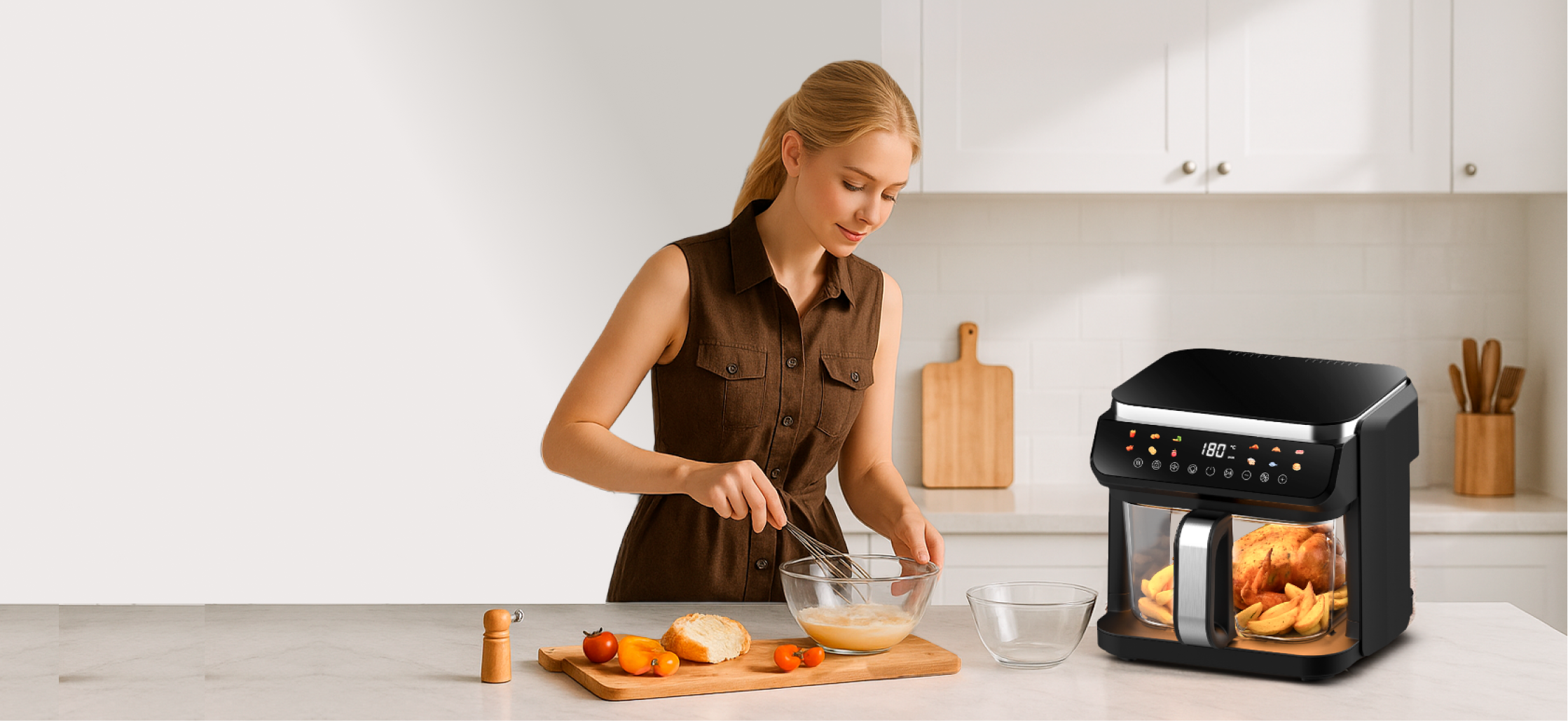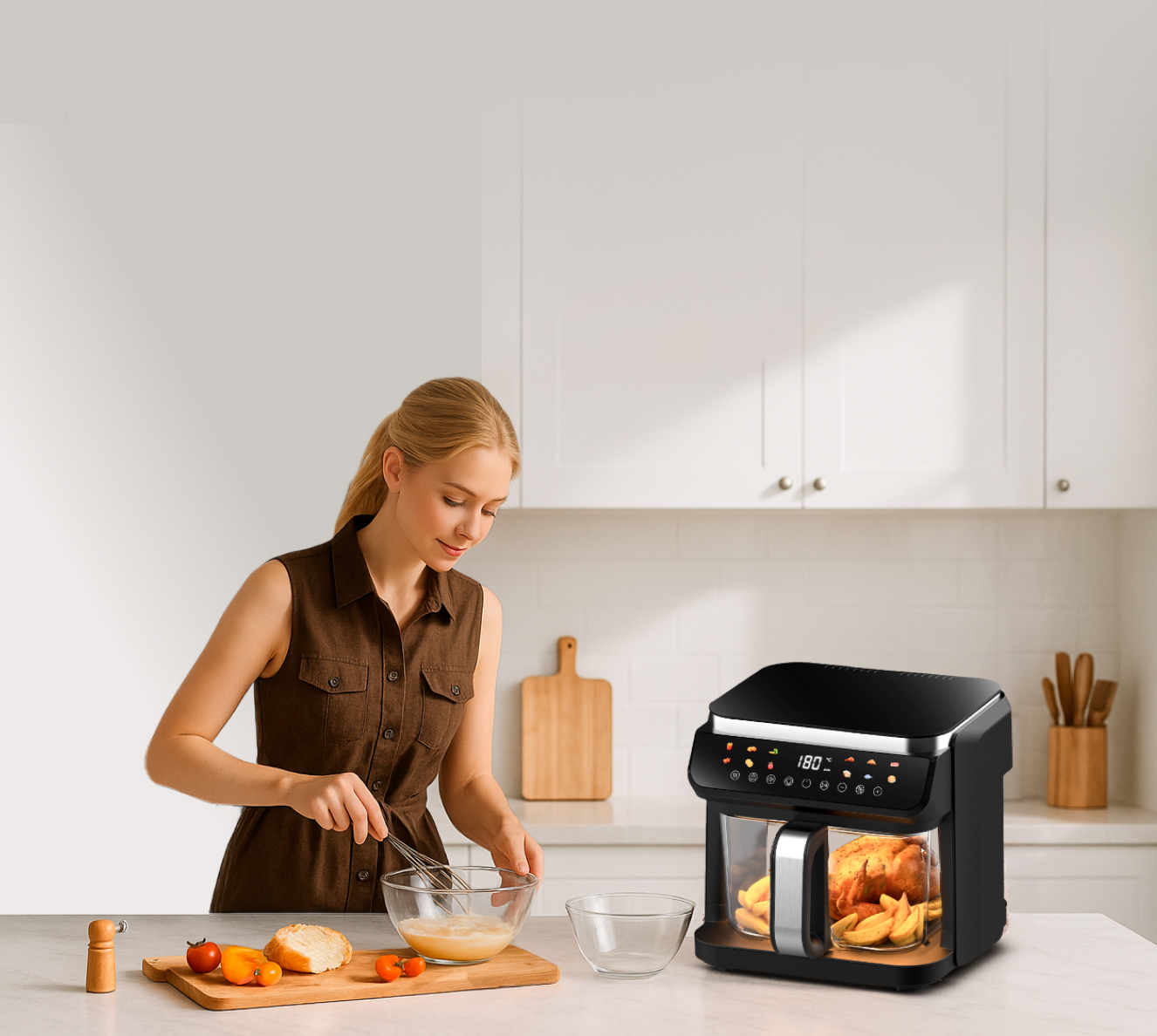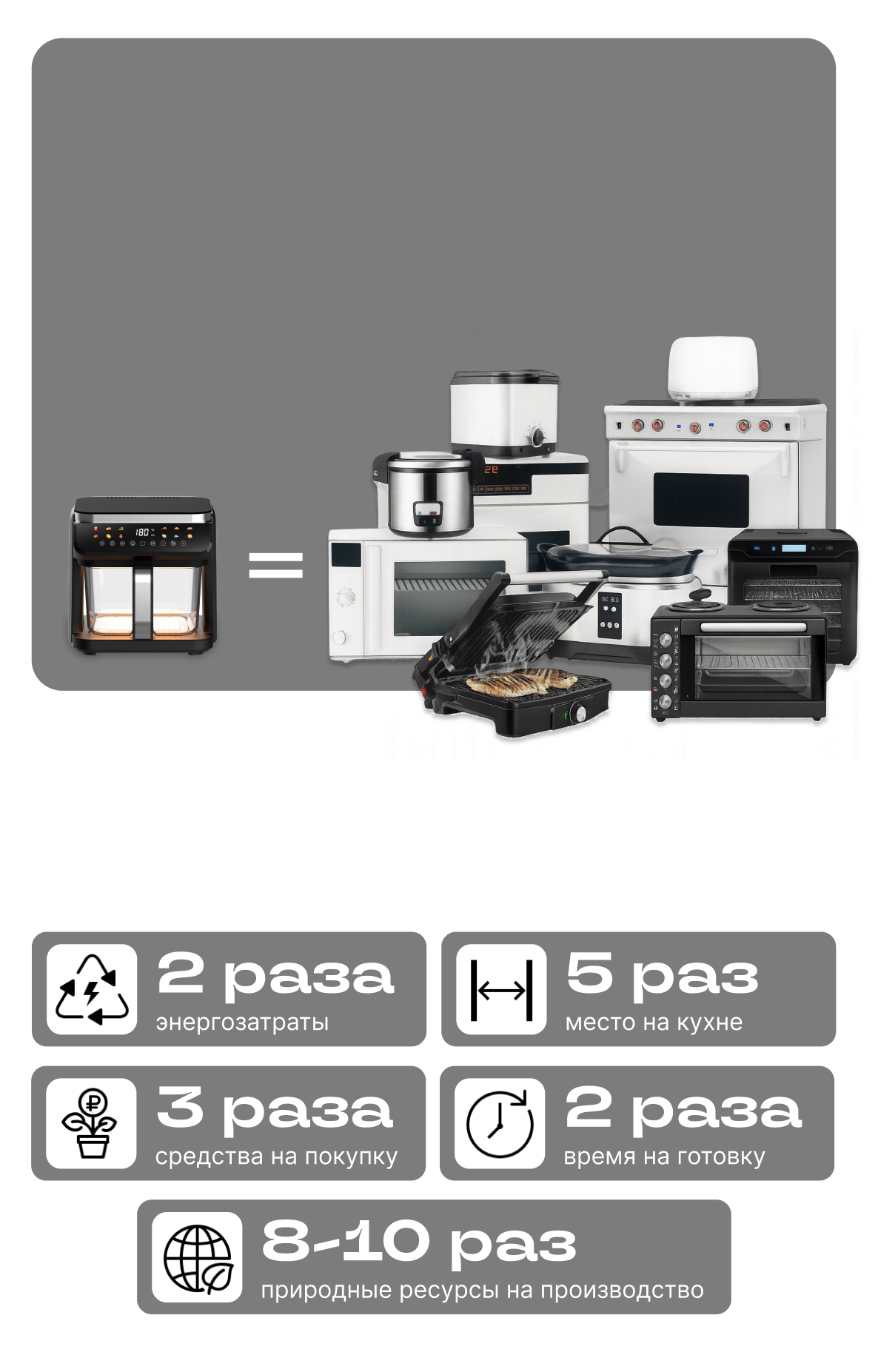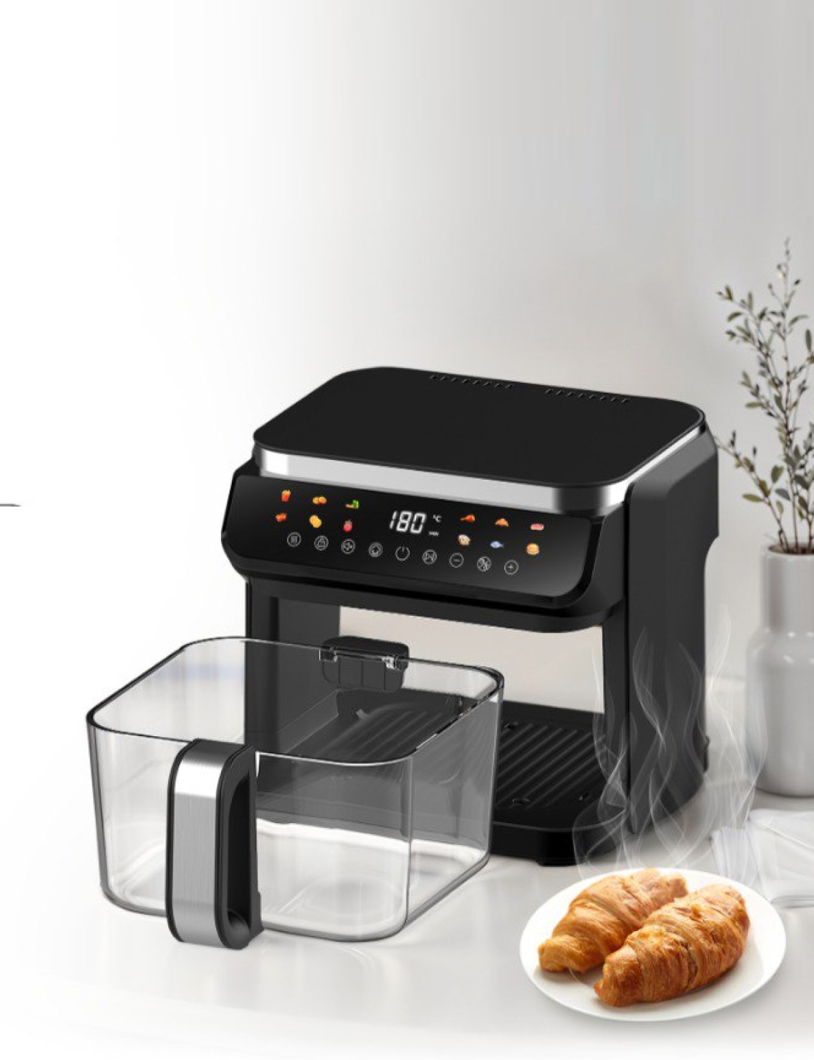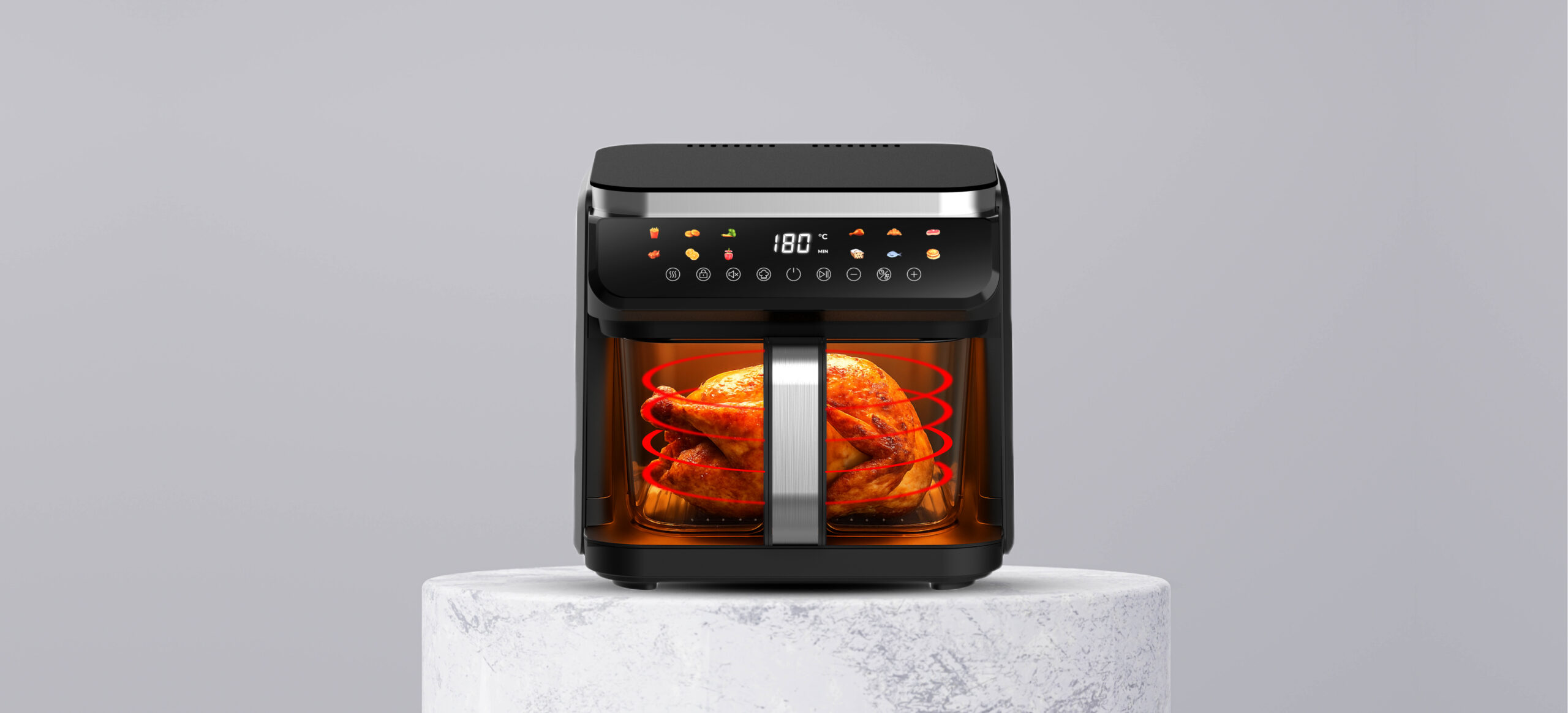 Аэрогриль оснащён вместительной чашей 5,5 л из ЭКО-стекла с толщиной стенок 5 мм, что помогает обеспечивать равномерный нагрев и стабильный результат. Такой объём удобен для повседневных блюд и приготовления еды для всей семьи.